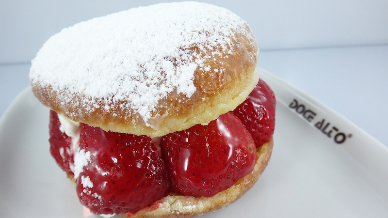 | Massa fofa e leve, frita no ponto certo e envolvida em açúcar fino, recheada generosamente com creme suave e morangos frescos selecionados. |