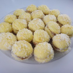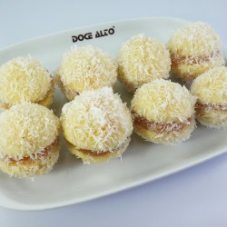 Bem casados, muito fôfos, recheados com doce de leite e que podem cobertos com côco ralado ou polvilhados com açúcar. Mantém as suas propriedades pelo menos até 4 dias após a sua confecção. Preço para 1/4 Kg que se traduz em cerca de 8 unidades.