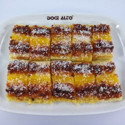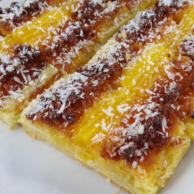 Base de Massa Folhada com recheio de creme de ovos, massa de côco e ovo que vai a tostar no forno, coberta com côco ralado. Mantém as suas propriedades pelo menos até 24 horas após a sua confecção. Preço para 1/4 Kg que se traduz em cerca de 12 unidades.