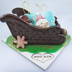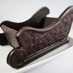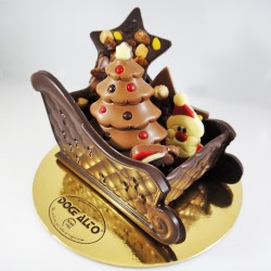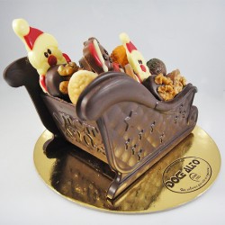 Trenó de Natal feito em chocolate de altíssima qualidade. Pode escolher o tipo de chocolate. Pode ser cheio com bombons sortidos ou bolachinhas de Natal (vendidos à parte). Uma bela e deliciosa oferta para miúdos e/ou graúdos!